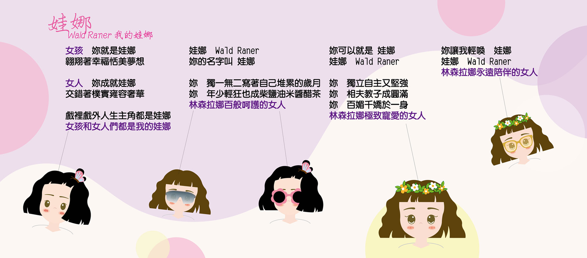 女孩 妳就是娃娜 翱翔著幸福恬美夢想女人 妳成就娃娜 交錯著樸實雍容奢華戲裡戲外 人生主角都是娃娜女孩和女人們 都是我的娃娜